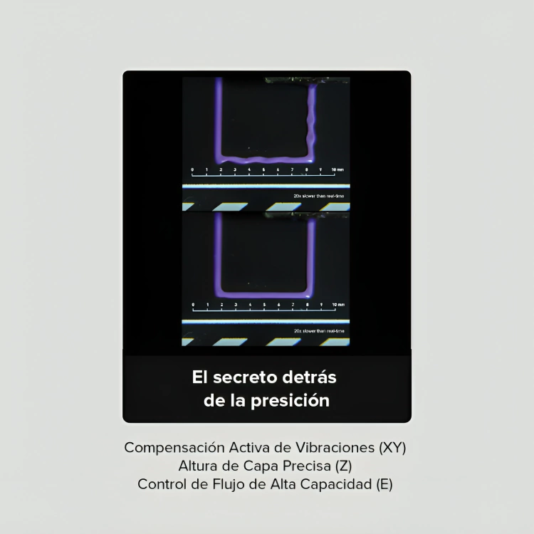 Alcanza hasta 500 mm/s con una aceleración de 20 000 mm/s², manteniendo un acabado uniforme gracias al control de vibraciones (input shaping) y ajuste automático de presión.