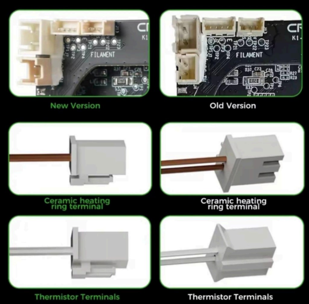 Por otra parte, hay algunos de los equipos que no toman el CFS dado a la desactualización de la placa PCBA del hotend de las K1. Este mismo cambio de versión con los distintos lotes. Para verificar las diferencias entre las distintas versiones hay que chequear los conectores, como figuran en la siguiente imagen.